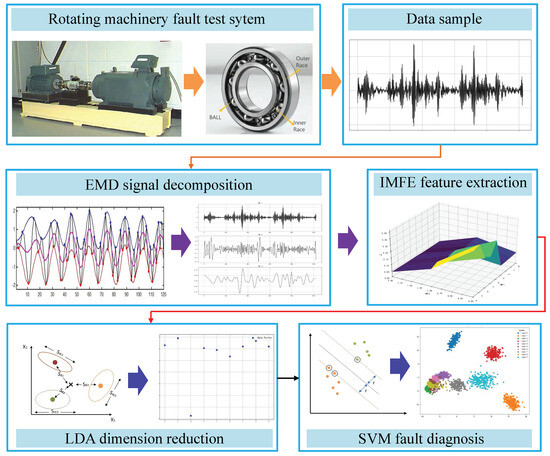 - An intelligent fault diagnosis method for rotating machinery is proposed, consisting of four modules: data decomposition, feature extraction, feature dimensionality reduction, and fault diagnosis. First, the empirical mode decomposition (EMD) method is used to perform three-layer decomposition on the data, yielding three intrinsic mode functions. Then, the signal features extracted using IMFE are input into linear discriminant analysis (LDA) for dimensionality reduction. Finally, the support vector machine (SVM) algorithm is employed as the classifier to achieve fault diagnosis, with K-fold cross-validation methods utilized to evaluate the diagnostic model’s performance [19].