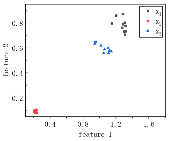 - The vibration signal data are input (), where any sample () is an n-dimensional vector, with . Let represent the fault class label, where .