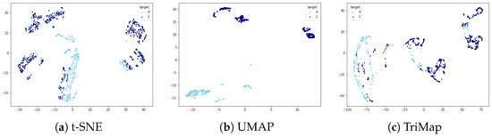 Each combination of these parameters resulted in a unique UMAP transformation, producing different data distributions in two-dimensional space. To quantify the variability across these transformations, we computed the cluster centroids for each class in each dataset and calculated the variance in their coordinates across the 50 transformations. The results, presented in Table 2, show considerable variability in the centroid positions, with the smallest variance being . This significant variation highlights the sensitivity of UMAP to initialization and hyperparameters, which can lead to inconsistent cluster structures depending on the settings chosen.