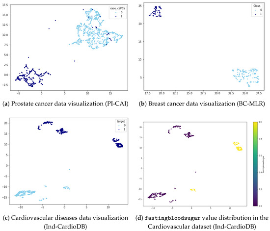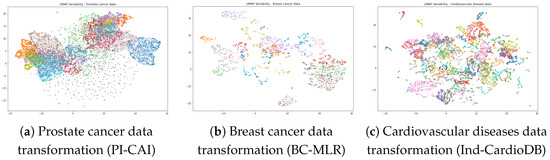 This sensitivity analysis highlights the importance of carefully selecting UMAP parameters to ensure meaningful and reproducible results, especially when used for synthetic data validation and clustering tasks. Figure 5 illustrates the UMAP-transformed representations of three different datasets for the appropriate initialization. For these datasets, the chosen parameters are n_neighbors and min_dist. The random_state values were set to 23 for the prostate cancer data, 80 for the breast cancer data, and 76 for the cardiovascular disease data to ensure reproducibility.
