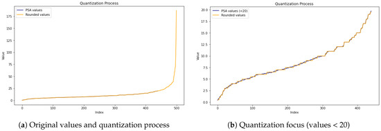 The next step defines the range (M) of possible synthetic values assigned to each feature. The range is obtained by analyzing the reference dataset, obtaining the minimum and maximum values and the step-size between different values. For categorical, logical, or ordinal variables, this is straightforward. However, continuous features require a quantization step to convert continuous values into discrete intervals suitable for controlled synthetic data generation. Quantization is a key element for continuous features to allow discrete, controlled synthetic values for comparison and validation.
