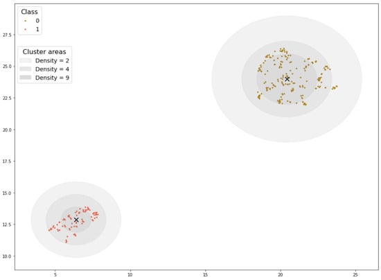 - Density threshold for cluster area definition: cluster validation involves establishing a radius around each centroid within which synthetic samples are validated. The radius is adjusted until the sample density within it falls below a pre-set threshold and the percentage of points in the cluster within this radius meets an established threshold. The percentage threshold depends on the aim of the methodology; in this case, the interest is to define a cluster area that comprises a wide majority of the samples, and therefore the threshold is set to 90%. Synthetic samples falling within the validated cluster areas are then assigned to the corresponding cluster; those outside any cluster radius are not validated and thus discarded.Since the density threshold determines the effective cluster area for synthetic data validation, it should be adjusted based on the reference data sample size and the shapes observed in the UMAP-reduced space. This adjustment ensures that the synthetic samples conform well to the reference dataset’s inherent structure.