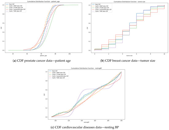 To evaluate the quality of our UMAP-based synthetic data generation algorithm, the obtained fidelity and utility metrics are compared with the analog measures for three widely used state-of-the-art methods: CTGAN, CopulaGAN, and TVAE. These methods are commonly applied in healthcare data generation [38,39,40] and provide effective benchmarks for assessing the performance of our algorithm.