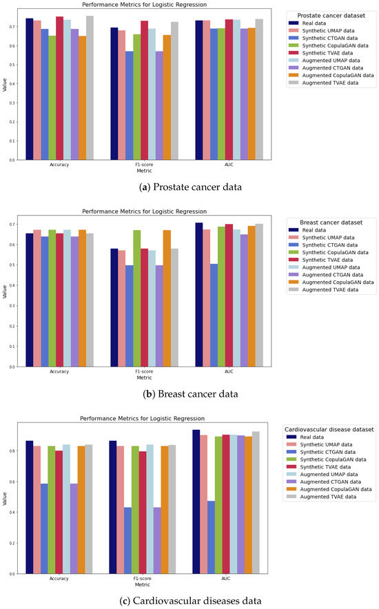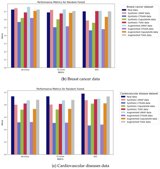 Contrasting with the previous models, the cardiovascular diseases scenario (Figure 13c) showcases superior performance for synthetic and augmented datasets compared with real data. Among these, the UMAP-generated data stand out, delivering excellent results and outperforming all other datasets across the evaluated metrics.