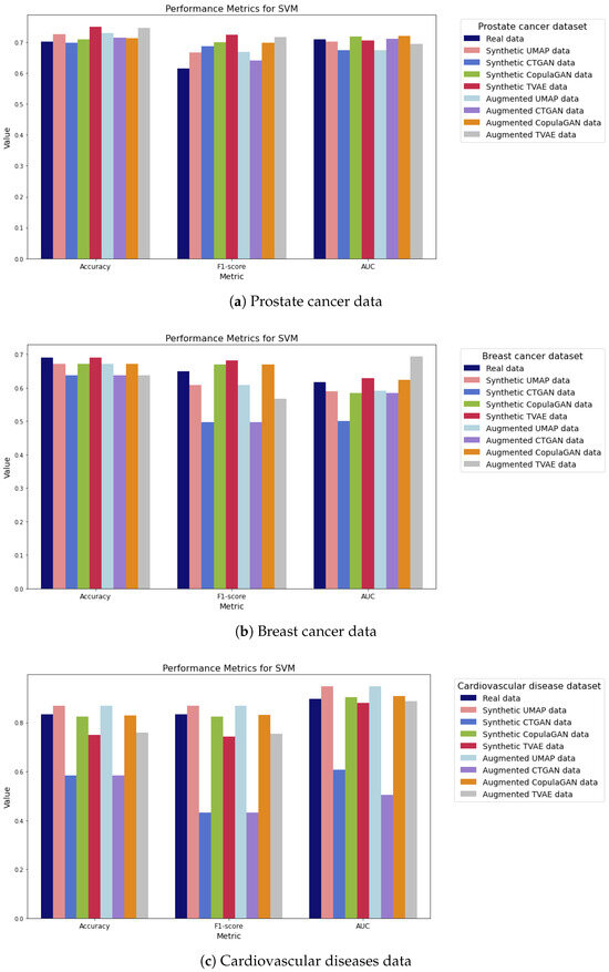 Support vector machine (SVM) results, presented in Figure 13, provide further insights. For prostate cancer data (Figure 13a), synthetic and augmented datasets perform similarly, slightly exceeding the performance of real data across most metrics. Notably, the F1-score demonstrates a significant improvement with synthetic datasets.