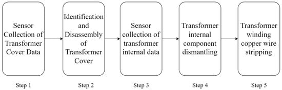 The disassembly process of the transformer is shown in Figure 1 and consists of five main steps. First, data from the transformer’s cover plate are collected through sensors, providing the necessary support for identifying the type and structure of the cover plate. Next, the system uses the collected data to identify and classify the transformer cover plate and selects the appropriate disassembly method, such as unscrewing screws or welding and cutting, to complete the disassembly of the cover plate. After the cover plate is removed, the sensors further collect data on the internal components of the transformer, helping the system understand its internal structure and component characteristics. Then, the system performs precise identification and disassembly of the internal components of the transformer to ensure that important parts are effectively separated. Finally, the system processes the transformer’s winding section, stripping the copper wire for recycling. The entire process is efficient and safe, leveraging multimodal perception and intelligent control technologies to achieve the full disassembly of obsolete transformers.