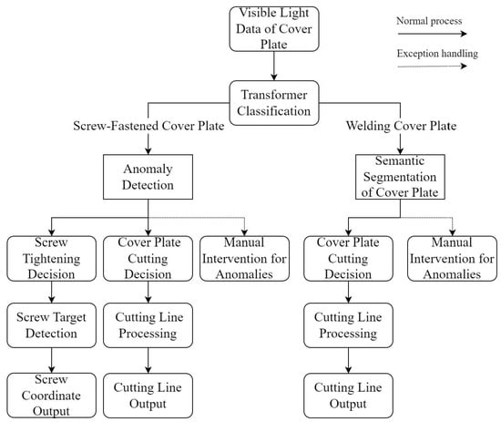 The cover disassembly process is illustrated in Figure 2. The system captures multi-view 2D images and 3D point cloud data using RGB-D cameras, employing fusion algorithms to improve feature extraction and address recognition challenges in complex environments. Initially, the system identifies the cover connection type using a pre-trained classification model, categorizing it as either screw-fastened or welded.
