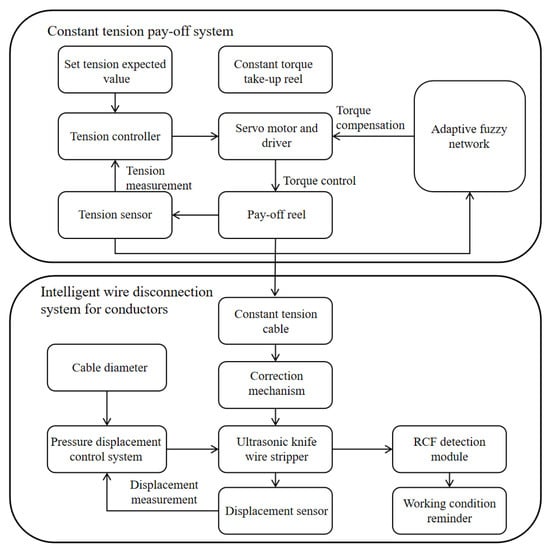 The principle of payoff tension control operates as follows: The payoff motor speed regulates the forward speed of the production product at the payoff stage, while the traction speed or take-up speed governs the speed at the traction or take-up locations. These speeds are synchronized through data processing and coordination by the main control unit, creating a speed differential that generates the required payoff tension on the production product. The constant tension intelligent servo unwinding system is a high-precision control system designed to manage the wire unwinding process. By precisely controlling the unwinding tension, it prevents stretching, deformation, or breakage of the wire, ensuring product quality and production efficiency. In this system, a servo motor accurately controls the output torque of the unwinding mechanism to maintain a stable wire feeding speed. Tension sensors continuously monitor tension fluctuations during the feeding process. The controller utilizes a combination of traditional PID control and adaptive fuzzy neural networks to optimize the servo motor’s control strategy. The intelligent wire removal system for conductors uses an ultrasonic cutter head to strip the outer insulation layer of the wire within a constant tension payoff system. It integrates a control algorithm that leverages pressure and vision sensors to regulate the cutting depth of the insulation layer, ensuring complete removal while protecting the cutter head. To enhance precision, the system is equipped with a displacement sensor that accurately measures the robotic arm’s movement, ensuring operational accuracy. An ARM microcontroller serves as the control system, employing PID algorithms for real-time control of the cutter head’s feed depth. Additionally, a camera monitors the wire removal process, while the RCF algorithm, integrated with a neural network, performs real-time detection to confirm whether the wire has been fully stripped.