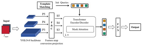 To fully leverage the transformer’s feature conditions, this paper employs a target detection method based on YOLOv8 [] integrated with Mask Attention [] for the precise localization of each nut. Given the challenges associated with transformer nuts, such as rust, contamination, and breakage, traditional target detection methods may struggle to effectively utilize depth information and subtle features. This approach enhances the target detection network by incorporating Mask Attention to focus on small targets like nuts on the cover plate. Additionally, it introduces embedded nut template matching to initialize the Query against the complex backgrounds of the transformer cover, accounting for possible occlusions, partial wear, or rust. This strategy aims to better utilize the shape and distribution characteristics of the nuts, thereby improving detection accuracy in complex environments. The modified network structure is illustrated in Figure 6.