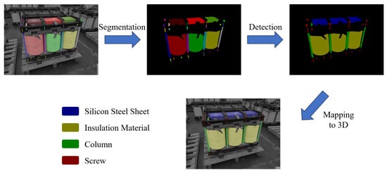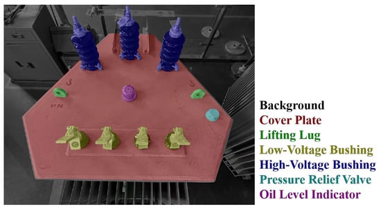 - Semantic Segmentation of Images: First, the input image of the transformer cover is processed by a semantic segmentation model to generate a mask that identifies the location of key components such as bolt holes and pipe connections.where is the binary image containing each component area.