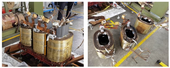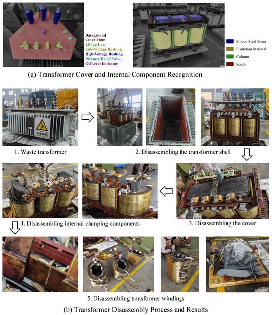 In order to make our experiment appear more comprehensive and to demonstrate the effectiveness of our method, we provide additional disassembly photos, as shown in Figure 17. Figure 17a illustrates the transformer cover and internal component recognition, while Figure 17b shows the process and photos of the dismantling of discarded transformers.
