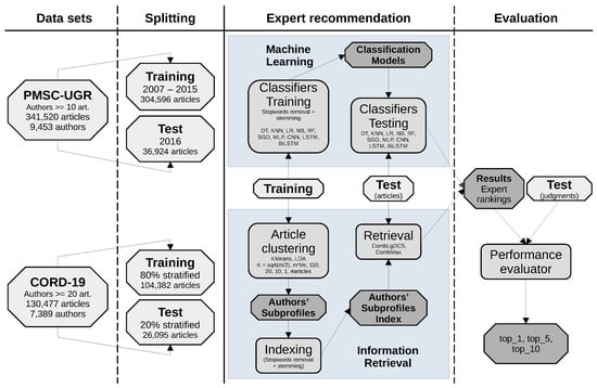 Both collections contained textual information consisting of the title, abstract, and keywords for each article, as well as the authors’ names/codes. This information was utilized differently depending on whether the article belonged to the training set or the test set. For training articles, the textual content was employed to train a model/profile that reflected the scientific interests and expertise of the authors. On the other hand, for an article in the test set, its content served the purpose of expressing the required information or expertise. It is important to note that the assumption underlying this approach was that the authors of the test articles were indeed experts in the topics discussed within them. This assumption was objective yet conservative, as it was reasonable to assume that other researchers working on the same or similar topics could also possess expertise in them. Consequently, our evaluation method resembled authorship attribution [67,68], in which the aim is to identify the authors of a test article (it is worth mentioning that we solely focus on the content of texts and do not employ stylometric features for this purpose, as is usual for authorship attribution [69]).