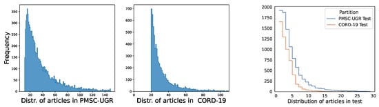 Author publication distribution in PMSC-UGR and CORD-19 datasets and articles’ respective distributions in the test partitions.