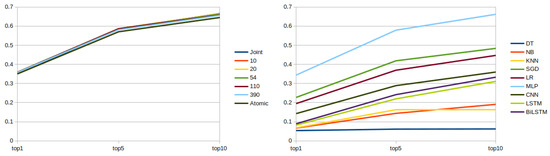 When focusing on K-means, it became apparent that the inclusion of subprofiles enhanced the performance of extreme alternatives (namely, Atomic and Joint), especially for top_1 and top_5, provided that K was not excessively high. For top_10, a relatively low value for K was preferable, and in this scenario, the best outcome was achieved when using a single profile per author.