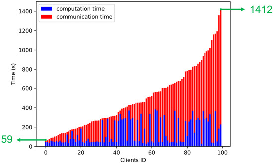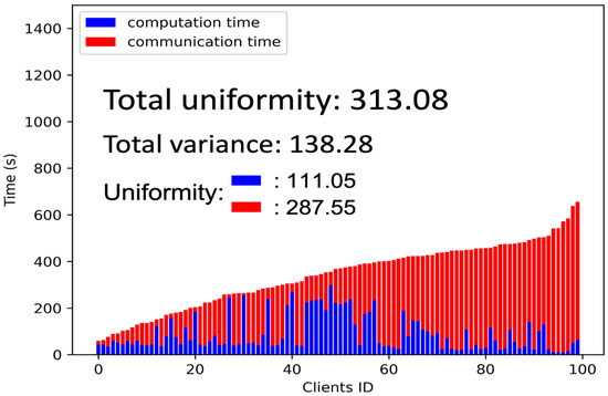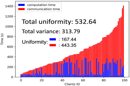 In Equation (1), refers to the time the i-th client during the training process, and represents the minimum time spent by any client. By calculating the squared deviation of each client’s time from the minimum time and then averaging them, we measure the uniformity of the training process across selected clients. Taking the result’s square root further helps provide a more interpretable value for the uniformity metric.