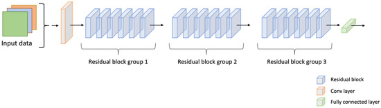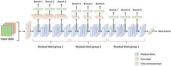 Similarly, we added branches combining one convolutional layer and a fully connected layer for the second group of residual blocks, following the same pattern of regular intervals. Finally, we added a single fully connected layer without any convolutional layers for the last group of residual blocks. The complete network structure, including the additional branches, is illustrated in Figure 4.