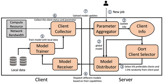 - Lai, F.; Zhu, X.; Madhyastha, H.V.; Chowdhury, M. Oort: Efficient Federated Learning via Guided Participant Selection. In Proceedings of the 15th USENIX Symposium on Operating Systems Design and Implementation (OSDI), Virtual event, 14–16 July 2021; pp. 19–35. [Google Scholar]