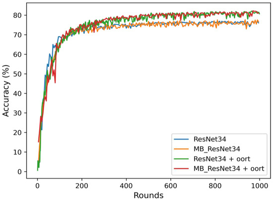 Our experiments evaluated the time taken to achieve accuracy levels of 60%, 70%, and 80%. Table 3 presents the experimental results concerning the FEMNIST dataset. The first row represents the performance of the ResNet34 model without the Oort selection algorithm. It took approximately 66,761 s to achieve 60% accuracy and 101,072 s to achieve 70% accuracy. In contrast, the MB_ResNet34 model achieved the same level of accuracy in significantly less time than the original ResNet34 model.