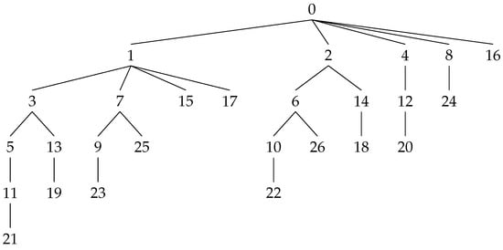 The graph in the last section is also natural; the proof of the fact that is a tree is simple. Finally, I found some hints to this claim in the literature. The graph arises naturally when one considers “Problems with Powers of Two”, the problem introduced by B. Haran and N.J.A. Sloane []. In the Online Encyclopedia of Integer Sequences (QEIS), T. Scheuerle makes a comment to A352178 []. He is probably formulating this claim.