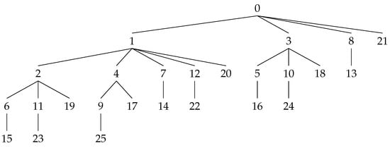 For the uniqueness, assume that we have two representations of n. Both of them can be interpreted as the path in (see the proof of the binary case). Since is a tree, we obtain a contradiction that proves the theorem. □