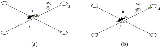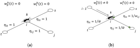 In (a), an ant k situated at node i assesses the desirability of adjacent edges as equal to 1 in the absence of both prior () and local knowledge (). In (b), when ant k reaches node i from node , it evaluates adjacent edges. If information on edge weights is either missing or not visible, the desirability is determined as the inverse of global knowledge. When the information is visible, the desirability is assessed as the inverse of the weight of the link.