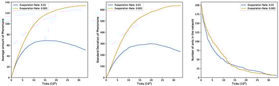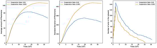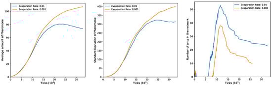 The plots for and in Figure 5 follow a similar trend. Both the mean and the standard deviation exhibit an initial increase during the simulation, followed by a decline, but only when . Under , both metrics reach stabilization. As ants gradually exit the environment, their ability to counteract pheromone evaporation is more effective with a low evaporation rate (), resulting in a higher degree of pheromone heterogeneity. Conversely, when the evaporation rate is higher (), the remaining ants in the network struggle to counteract pheromone evaporation, leading to a decrease in the mean and heterogeneity. Concerning the number of ants in the environment, it initiates at 40, with the fluctuations in the plot representing the intermittent entry of the five groups. Over time, ants exit at varying rates depending on the value of .