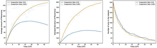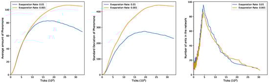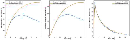 In Figure 3, the outcomes for and are illustrated. In the initial phase of the simulation, there is an increase in the mean of pheromones, coinciding with active exploration by a substantial number of ants in the environment. Subsequently, a decline occurs, more pronounced, with an evaporation rate of and a slower stabilization at . This pattern underscores the deep connection between mean pheromone levels and the presence of ants in the network. As ants exit the network, there is a corresponding decrease in the pheromone quantity on edges, particularly clear at a higher evaporation rate. This decrease is attributed to the reduced ability of the remaining ants to counteract the ongoing pheromone evaporation. The second plot mirrors these dynamics, illustrating changes in the standard deviation. Also, in this scenario there is an initial rise in the value during the simulation’s early phase, signifying an increase in the heterogeneity of pheromones as ants release them at the edges. As the ants gradually exit the network, the standard deviation decreases when and stabilizes when . This is consistent with the idea that a smaller ant population in the network results in a diminished ability to counteract the evaporation rate, ultimately leading to a more uniform distribution of pheromone levels across the edges. The third plot depicts the evolving number of ants in the network over time, starting at 200, corresponding to the initial exploration group in the configuration. As time progresses, ants exit with varied trends influenced by the value. Notably, these trends undergo an inversion around ticks.