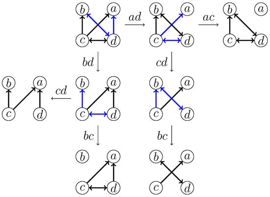 - Deletion of the edgeAfter deleting , vertices a, d, and b form an induced . The deletion of or will induce new forbidden structures, which will trigger the deletion of further edges. In particular, we have the following branching cases, as shown in Figure 3.