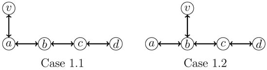 Figure 5. Two cases in which a vertex v has exactly one neighbor in an induced .In both subcases, there are indeed two induced s; hence, deleting only one edge is insufficient. Specifically, for Case 1.1, we apply the following branching rule:For Case 1.2, we apply the following branching rule:Both branching rules have the same branching vector of and a corresponding maximum branching factor of . - Case