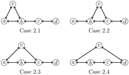 Figure 10. Four cases that need to be considered when a vertex v is adjacent to two vertices in an induced .For Case 2.1, we apply the following branching rule, where the branching vector is and the corresponding branching factor is :For Case 2.2, we apply the following branching rule, where the branching vector is and the corresponding branching factor is :For Case 2.3, we apply the following branching rule, where the branching vector is and the corresponding branching factor is :For Case 2.4, we apply the following branching rule, where the branching vector is and the corresponding branching factor is : - Case