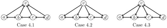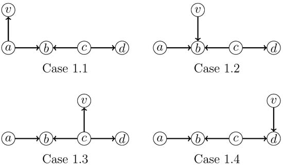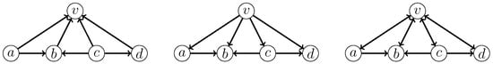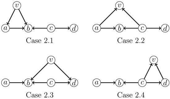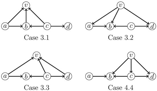 Figure 12. All possible subgraphs induced by a vertex fully adjacent to an induced in a reduced graph.Observation 1. Let G be a reduced graph. Then, all induced s in G are pairwise vertex disjoint.Observation 2. Let G be a reduced graph. Then, deleting any edge from an induced in G does not yield any new induced forbidden structures (–).Let i be the number of all induced in a reduced graph G. By Observation 1, we need to delete i edges to destroy all the induced s in G. By Observation 2, the resulting graph is a directed co-graph. In light of this fact, when we arrive at a reduced graph at a branching node, we determine that the given instance is a YES-instance if there are, at most, k induced s in the reduced graph.
