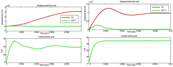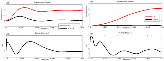 Figure 4 illustrates the displacement of the beam’s free end; the red line represents the displacement for the open loop of the beam, which means without control; the black line represents the displacement for the controller with μ-analysis. The results were very good when vibration suppression was achieved. In the bottom-left window, we take the control voltages for the free end of the beam with a maximum voltage of 15 Volt (Figure 4 bottom-left). The previous results are with Ko = 1.9 K: when Ko = 0.1 K (this translates to a ±90% deviation from the nominal value of the stiffness matrix K), the control voltages are 50 Volt (right down), and the displacement for the free end of the beam with and without control is shown in Figure 4 (upper-right window).