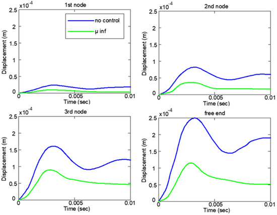 The displacement responses of this controller for the first mechanical input are shown in Figure 5. We take the results for the four nodes of the beam, and the results with the blue line are for the open loop, i.e., without control. The results with the green line are for μ-analysis, and the results with the μ-analysis are much better as we successfully rejected the oscillations. The previous results were in the state-space and frequency domains. The boundaries of the μ values are shown in Figure 6. As can be seen, the system continues to function robustly and steadily because the upper limits of both values remain below 1 for all relevant frequencies. This finding is confirmed in Figure 7, where the applied voltage and free-end movement are displayed at the maximum degree of uncertainty. The nominal controller performed better than the open-loop response for the identical system value of the stiffness matrix M.