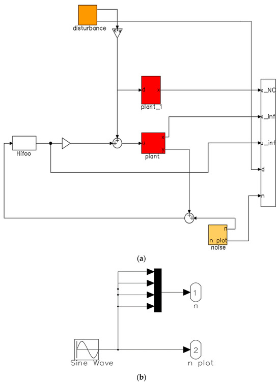 (a) The block diagram in Matlab Simulink for the smart beam disturbance rejection with Hifoo controller and sinusoidal disturbance. (b) The block diagram in Matlab Simulink for the smart beam with sinusoidal noise (percentage ± 2% of the disturbance).