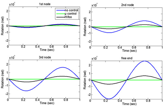 In Figure 9 and Figure 10, we can see the comparison with μ-analysis and the reduced-order control (Hifoo control) for all the nodes of the smart structure. Figure 9 shows the rotations for the four nodes of the structure, and Figure 10 shows the displacements. The results without control for the open loop are indicated by the blue line, the results with reduced-order control Hifoo are indicated by the black line, and the results with μ-analysis are indicated by the green line. The results are satisfactory, suppression of oscillations is achieved for dynamic loading, and both models of the control have very good results; meanwhile, the μ-analysis achieves a control model with almost zero displacement and rotation. Displacement rejection in smart structures refers to the ability of a structure to minimize or reject unwanted displacements in response to external forces or disturbances. This is a crucial aspect in the control system design for smart structures, especially in applications where precise positioning or stability is required. Displacement rejection was achieved in our study in both the μ-analysis and Hifoo control, employing a well-designed robust control system. Smart structures can actively counteract disturbances, maintain stability, and achieve precise control over their displacement, making them suitable for applications such as vibration suppression with robust criteria and structural positioning.