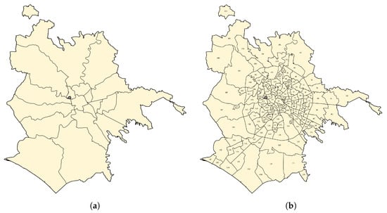 Visualization of the administrative division of the territory of Rome (“Municipi” and “Zone Urbanistiche”). (a) Districts of Rome, (b) Subdistricts of Rome.