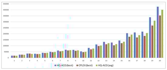 - For all the instances from ID 4 to ID 20, the average value of the feasible solutions identified by HQ-ACO is always higher than that of the best solution found by CPLEX. Naturally, this situation does not hold in the case of the three instances with ID 1–3 for which CPLEX finds an optimal solution. In the case of larger instances, the average value can be more than 10% higher with respect to CPLEX, granting a substantial amount of additional money from rental.
