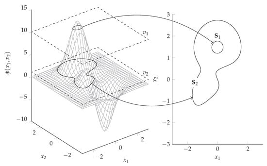 For a given mapping (here, the Peaks function of the MATLAB© software environment), the sets and for which , , respectively, applies are to be identified. The results are then the according isocontours.