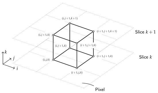 The marching cubes algorithm (MC) was introduced in [2] by W. E. Lorensen and H. E. Cline to find isovalues in medical imaging techniques such as magnetic resonance imaging (MRI), computed tomography scans (CT scan) and single-photon emission computed tomography (SPECT). Therefore, the initial data can be interpreted as pixels in a three-dimensional picture. A schematic representation of the data is shown in Figure 2. The k dimension represents the individual pictures, where the position of each pixel within one slice is represented by i and j. Hence, the cube presented in Figure 2 is constructed by four opposing pixels in two neighboring slices.