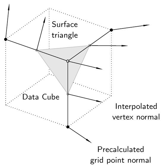 After calculating the gradient at the cube vertices, the gradient at the isovalue vertices can be determined using linear interpolation. Since the component of the gradient vector in the tangential direction of the isovalue surface is always zero, the gradient vector itself represents a normal vector of the respective vertex. In Figure 4, an example is depicted where the gradients of the cube vertices are known and yield the normal unit vectors at the vertices of the isovalue triangle.