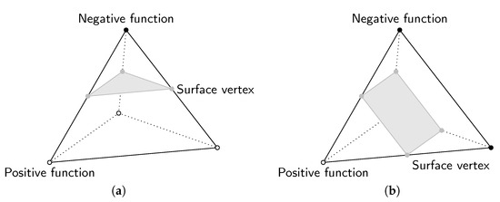 Y. Zhou et al. clarify in [25] that, despite the decomposition of the cubes into tetrahedra, the ambiguity problem has not yet been solved. Therefore, the authors propose a method of determining the intersection points and a criterion to test the intersection between the isosurface and the edge of the tetrahedron, which are based on the assumption that the function is linear along the edge of a cube. However, the authors deduce in [25] that there is a quadratic variation in the function value along the triangle edge t, as can be seen in Equation (4).
