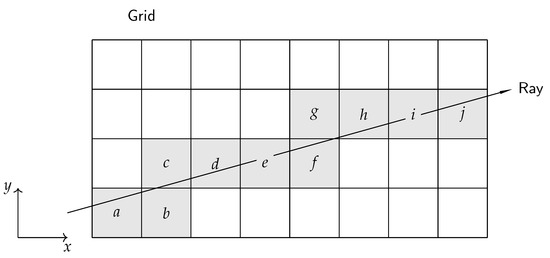 - Amanatides, J.; Woo, A. A Fast Voxel Traversal Algorithm for Ray Tracing; EG 1987—Technical Papers; Eurographics Association: Eindhoven, The Netherlands, 1987. [Google Scholar] [CrossRef]
