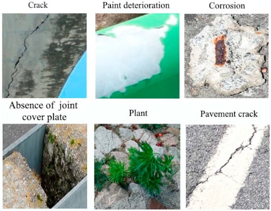 The second image group regards the context of bridge defects. This collection was created by capturing photographs of various bridges using a handheld camera and a mobile phone, resulting in a set of images with a diverse range of sizes and resolutions. Afterward, each image was manually labeled using a tool called LabelImg [53] and attributed to one of the six groups representing defect types: paint deterioration, plant, absence of joint cover plate, cracks, pavement crack, and peeling on concrete (Figure 2). In total, 2400 images were labeled. However, a pruning operation to remove unusable data had to be carried out, resulting in a final set of 1872 images. Civil engineers possessing technical expertise in the relevant domain both participated actively in the direct image acquisition process and provided support for the labeling procedures.