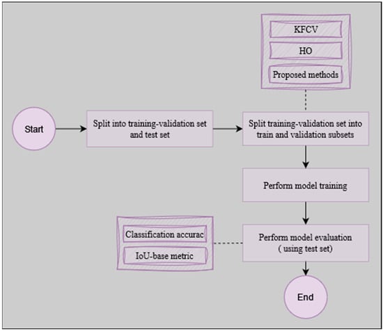 The process of model development begins with a critical step, which is the division of the original dataset into distinct subsets for training-validation and testing. This process serves as the foundation upon which the subsequent stages of model refinement and evaluation rest. The workflow of this work (Figure 4) begins by partitioning the original raw data into the training-validation and testing subsets, at a rate of 80% and 20%, respectively. Then, the training-validation subset is subdivided once again into train and validation subsets. During the evaluation step, a set of commonly used metrics is employed to assess resulting models, namely, involving accuracy and intersection over union (IOU). These metrics characterization can be found below: