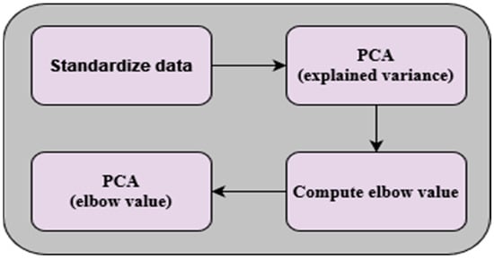 In addition, PCA was included to systematically perform dimensionality reduction upon the VGG16-based feature maps. A fundamental principle of the PCA implementation was the criterion of maintaining components that collectively explain at least 99% of the variance within the data. By keeping only those components that encapsulate the most significant information, we ensure the preservation of the essence of the dataset while simultaneously eliminating noise and redundancy. To ensure the effectiveness of PCA, a prerequisite step involved the standardization of the data, which involves transforming the variables to have a mean of zero and a standard deviation of one, preventing features with larger scales from disproportionately influencing the PCA process. To reach a functional dimensionality reduction, the selection of the final number of components is vital. To this end, the elbow value is computed by analyzing the explained variance ratio derived from PCA. The elbow value can be interpreted as the inflection point at which the marginal gain in the explained variance diminishes significantly. Once the elbow value was established, it was employed to guide the final reduction of features. Only the relevant components, as determined by the elbow value, were retained for the transformation of the data. This step resulted in the generation of a new feature space, compactly encapsulating the most valuable aspects of the original data. The implemented PCA process is depicted in Figure 7.