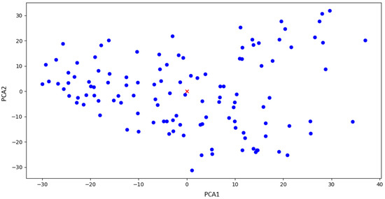 Visualization of centroid point of features for the class of “absence of joint cover plate” for , for exemplification purposes. The blue dots represent the distribution of features, while the red cross is the global centroid.