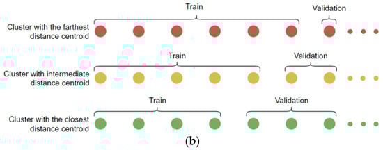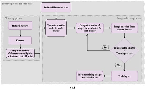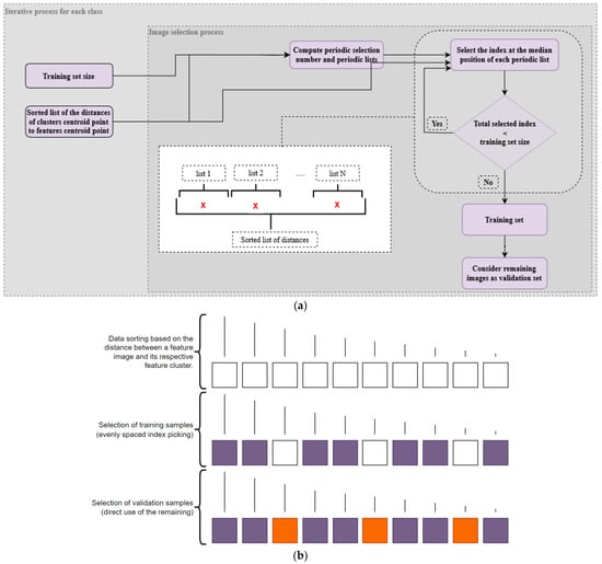 These variables are integrated into an image selection process, which performs a series of computations. The first step involves calculating a factor number to divide the main list into evenly weighted subgroups, i.e., as much as possible, with the same number of elements, as shown in Equation (5), and, afterward, determine proper positions/indexes for image extraction. Then, within these formed subgroups, the focal point is the identification of the median-positioned images. Thus, for each subgroup, images at the median index are picked and used to set up the . This median-picking operation is executed until the total number of images within the is reached. Lastly, the remaining images are allocated to the . This approach aims to guarantee that the selected training images are distributed evenly across the spectrum of distances between the features of each image and the centroid point of all features.