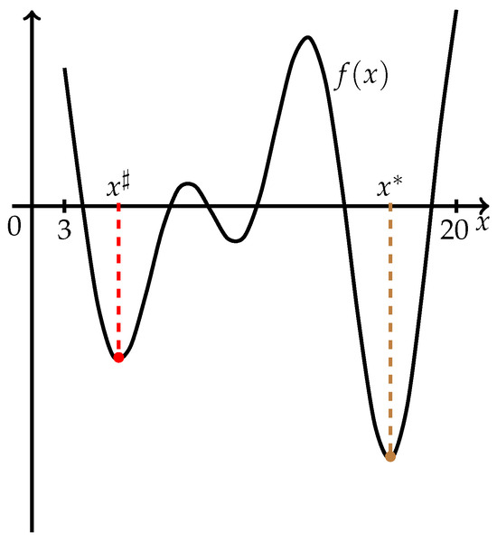 The geometrical interpretation of failure of the Golden Section Method in finding a global minimum can be given on the basis of problems 7 and 11 from Table 2. In these cases, only local minimum points were determined, and, as can be seen from Figure 1 and Figure 2, the global minimum points are located closer to the endpoints of the feasible intervals. Hence, we can make the following assumption: univariate multimodal problems with global minimum points located more or less in the middle of the intervals are more efficiently tractable by the Golden Section Method from the global optimization point of view. This topic needs further theoretical investigation and is not the subject of our paper.