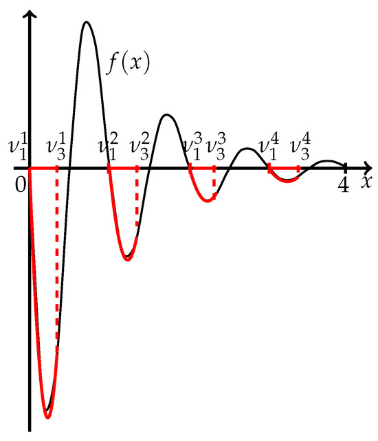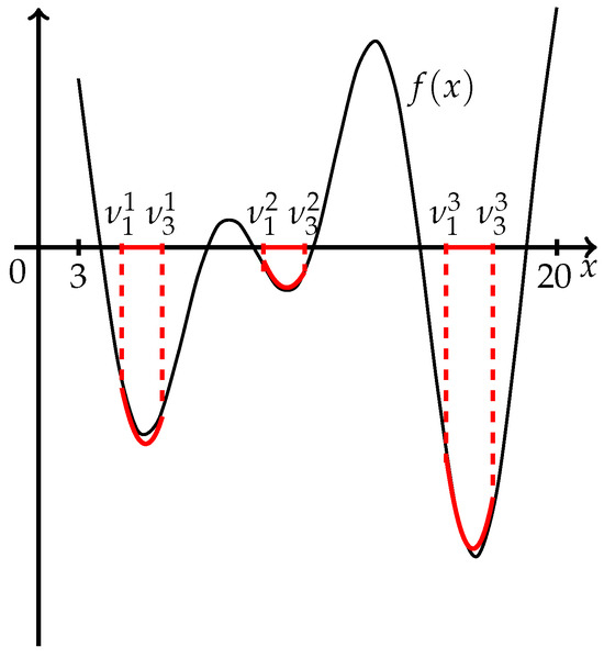 Problem 11: . Initial value . The TPP procedure was run four times. After the first run, one subinterval with one three-point pattern was obtained, after the second run, two subintervals with two three-point patterns were obtained, after the third run, four subintervals with four three-point patterns were obtained, and after the fourth run, four smaller subintervals with four three-point patterns were obtained again. The TPP procedure was stopped, and . The total number of function evaluations was equal to 24. Then, with the accuracy , we ran the Parabola Method, which stopped after two additional function evaluations for each subinterval. The final subintervals, the three-point pattern (TPP), the corresponding starting parabolas, and additional function evaluations () of the Parabola Method over each subinterval are given in Table 3.