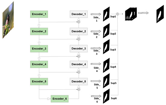U2Net is used for salient object detection (SOD), which aims to segment the most prominent object in an image. Unlike image recognition, SOD focuses more on local detail information and global contrast information, rather than deep semantic information. Therefore, the primary research focuses on extracting features at multiple levels and scales. The network structure of U2Net is shown in Figure 1. The overall structure is an encoder–decoder architecture known as U-Net, in which each stage consists of a residual U-block (RSU). This module consists of a two-layer nested U-structure. The U2Net is designed to support deep architectures with rich multiscale features while incurring relatively low computational and memory costs. The architecture is built exclusively using RSU blocks and does not depend on any pretrained backbone network for feature classification. This makes it flexible and adaptable to various work environments with a minimal loss of performance.
